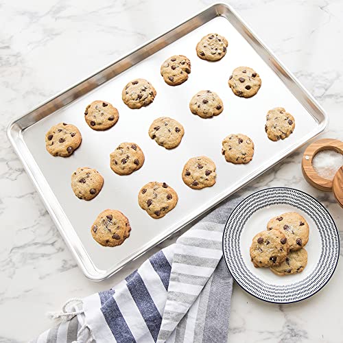 Make mega batches of cookies and bars with this extra large sheet pan. Fits all standard size ovens. 35 percent larger surface than the half sheet! Our commercial-duty Naturals Bakeware is made of even-heating, rust-proof aluminum and features a galvanized steel reinforcement around the rims for added strength. Bakers agree that aluminum bakes best. Hand-wash cleaning only. Made in the USA. Nylon, wood, or silicone utensils are recommended. Metal utensils and scouring pads may scratch natural aluminum pans, but will not affect baking performance