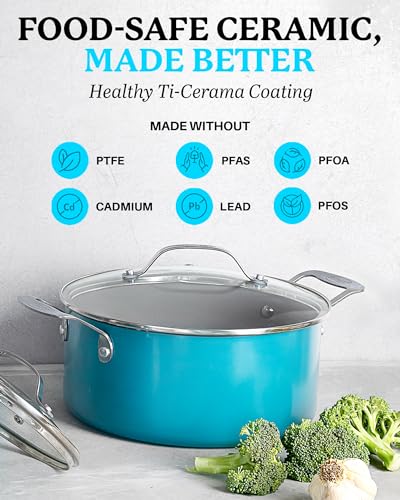 Gotham Steel Ocean Blue 5-Quart Stock Pot with Ultra Durable Diamond Coating – Oven & Dishwasher Safe, 100% PFOA Free, Includes Tempered Glass Lid. ULTIMATE CERAMIC NONSTICK – the Gotham Steel nonstick cooking surface is coated three times and then reinforced with diamonds to deliver the ultimate food release. No seasoning or even oil or butter needed, makes for healthier eating, and provides for hassle free, 1-2-3 cleanup. HEALTHY & NON-TOXIC – the Gotham Steel coating is composed of ceramic and reinforced with titanium, ensuring this frying pan free of PFOA, PFOS, lead & cadmium for an eco-friendly, healthy experience for your entire family. METAL UTENSIL SAFE – the coating of the pan is infused with diamonds, the strongest material on earth which makes it durable enough to withstand metal utensils, spatulas, spoons, whisks and even electric beaters while delivering years of outstanding, nonstick use. EFFORTLESS CLEANUP, DISHWASHER SAFE– spend less time with cleanup! After all the cooking and prepping is done, place cookware in the dishwasher for quick and easy cleanup. STOVETOP & OVEN SAFE – compatible with gas, electric, glass cooktops & oven safe up to a sizzling up to 500° Fahrenheit, lids included.