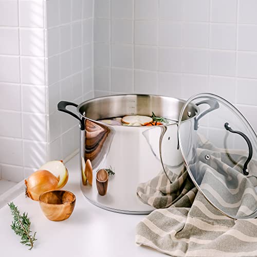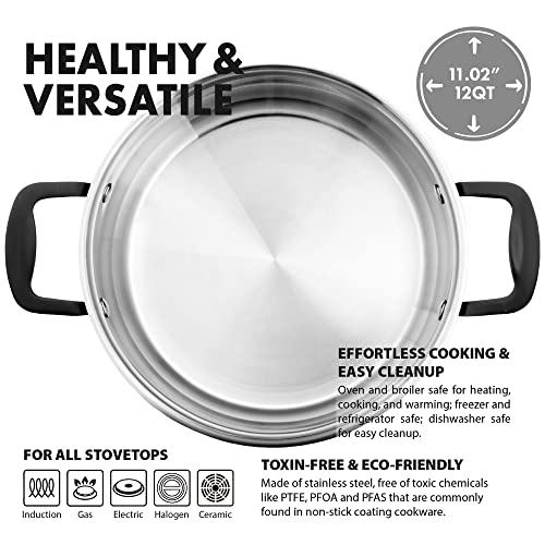 🔘 DESIGNED FOR EFFORTLESS COOKING: Versatile 3 gallon pot you can count on day in and day out. Compatible with all stovetop including induction, gas, electric, halogen and ceramic. Oven safe pot and broiler safe for heating, cooking, and warming; freezer and refrigerator safe. Dishwasher safe for fast and easy clean-up, let your dishwasher do all the work! Made of stainless steel, free of toxic chemicals like PTFE, PFOA & PFAS that are commonly found in non stick pots coating cookware.