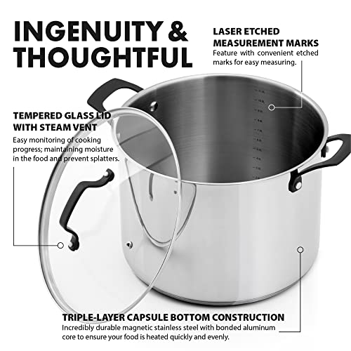GrandTies Tri-Ply Stainless Steel Stock Pot Induction Cookware – 12 QT Capsule Bottom Stainless Steel Pot, Marquina Black Metal Handles Kitchen Cooking large Pot with Lid, Dishwasher Safe Pot & Pan
