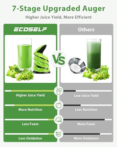 🧹【Easy to Assemble & Clean】Our ECOSELF masticating juicier features a hopper & screen integrated design, which can be easily assembled and disassembled in minutes.😄 Except for the motor base, other parts can be quickly cleaned with water, with an included brush for a hassle-free cleanse.