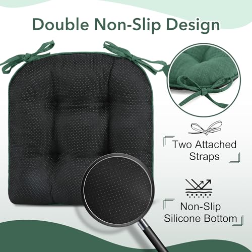 downluxe Indoor Chair Cushions for Dining Chairs, Tufted Overstuffed Textured Memory Foam Kitchen Chair Pads with Ties and Non-Slip Backing, 15.5″ x 15.5″ x 4″, Dark Green, 4 Pack