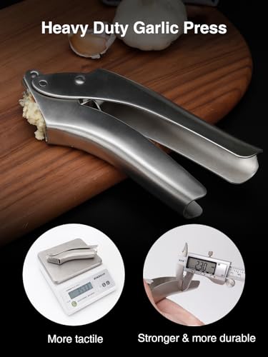 Heavy Duty Garlic Press: 100% Garlic Crushed, No Waste. Our heavy duty garlic press guarantees complete garlic extraction with zero waste. Every clove is meticulously crushed to release its full flavor, ensuring your dishes are bursting with the rich essence of garlic.
