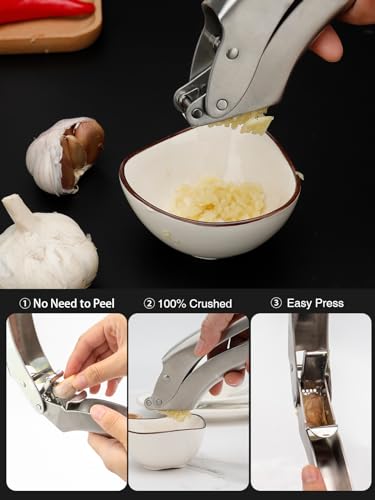Garlic Press, Heavy Duty Garlic Press,Professional Garlic Mincer, No Need To Peel, Easy to Clean, Ergonomic Handle,304 Stainless Steel, Garlic Crusher 5 Year Warranty