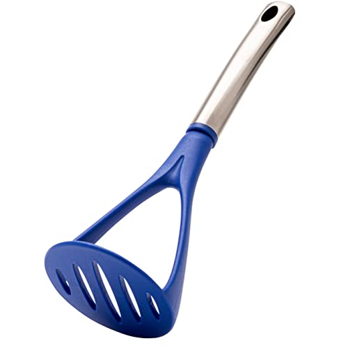 Mash your potatoes, beans, avocados, and so much more with our versatile and durable potato masher. With a nylon bottom, our masher can be used in nonstick pots, and the rounded stainless steel handle is designed to allow you to mash mounds of veggies pain-free. Integrated hanging hole makes storage simple, and the fun blue design adds a pop of personality to your kitchen decor. Dishwasher safe for convenient cleanup. Try our masher today!